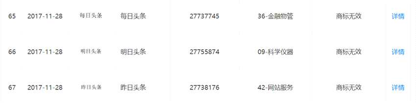 天眼查顯示,除了今日頭條,北京字節(jié)跳動(dòng)科技有限公司曾于2013年申請(qǐng)注冊(cè)“每日頭條”商標(biāo),目前多品類(lèi)商標(biāo)為已注冊(cè)。隨后2017年申請(qǐng)注冊(cè)“明日頭條”“昨日頭條”“每日頭條”商標(biāo),后被宣告商標(biāo)無(wú)效。