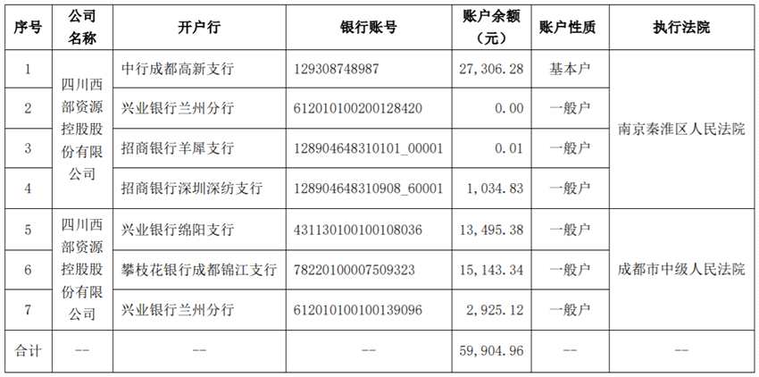 西部資源7個銀行賬戶被司法凍結(jié),賬戶余額為59904.96元
