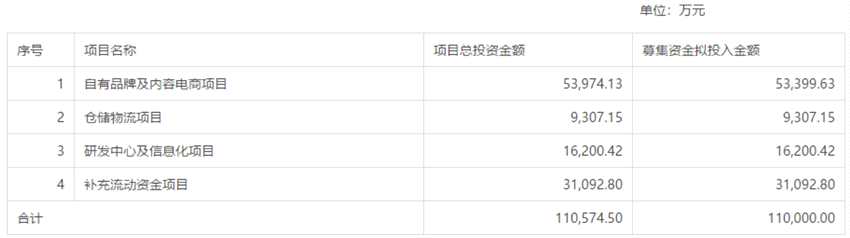 公司本次向特定對(duì)象發(fā)行股票的募集資金總額不超過11億元(含本數(shù)),扣除發(fā)行費(fèi)用后,募集資金擬用于自有品牌及內(nèi)容電商項(xiàng)目、倉儲(chǔ)物流項(xiàng)目、研發(fā)中心及信息化項(xiàng)目和補(bǔ)充流動(dòng)資金項(xiàng)目。
