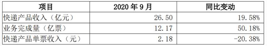 公告顯示,9月公司快遞產(chǎn)品收入26.5億元,同比增長19.58%;業(yè)務(wù)完成量12.17億票,同比增長50.18%;快遞產(chǎn)品單票收入2.18元,同比下滑20.38%。