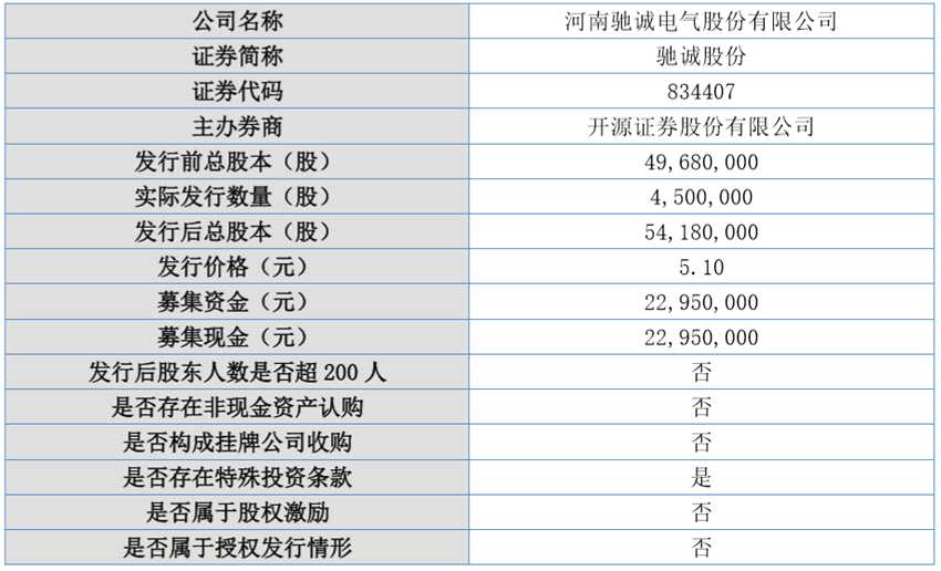 10月21日,獲悉,新三板公司馳誠(chéng)股份(834407.OC)本次定增實(shí)際發(fā)行數(shù)量450萬(wàn)股,發(fā)行價(jià)格為5.10元/股,實(shí)際募集資金2295萬(wàn)元。