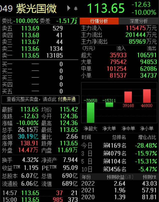 今日早盤,紫光國(guó)微小幅低開,隨后迅速暴跌8%,開盤不到半個(gè)小時(shí)便被巨額賣單砸死跌停,股價(jià)也從124元/股跌至113元/股,市值縮水高達(dá)70多億。截止收盤,紫光國(guó)微封死跌停,封單超一萬手,報(bào)113.65元,成交金額超30億元,換手率4.32%。