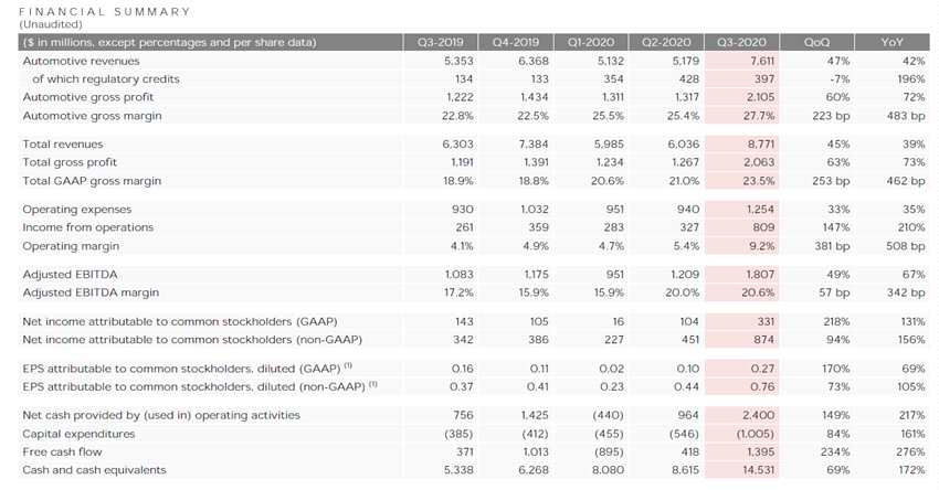 10月22日,獲悉,美股上市公司特斯拉(TSLA.US)發(fā)布2020年第三季度財(cái)報(bào)。財(cái)報(bào)顯示,特斯拉第三季度總營(yíng)收87.71億美元,同比增長(zhǎng)39%,環(huán)比增長(zhǎng)45%。其中,汽車(chē)業(yè)務(wù)營(yíng)收為76.11億美元,同比增長(zhǎng)42%,環(huán)比增長(zhǎng)47%;汽車(chē)業(yè)務(wù)毛利率為27.7%。