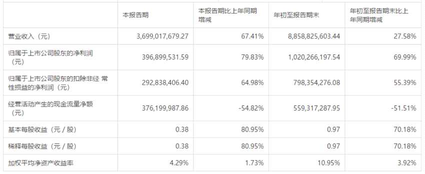 第三季度,大族激光實現(xiàn)營業(yè)收入36.99億元,比上年同期增長67.41%,歸屬于上市公司股東的凈利潤3.97億元,比上年同期增長79.83%。