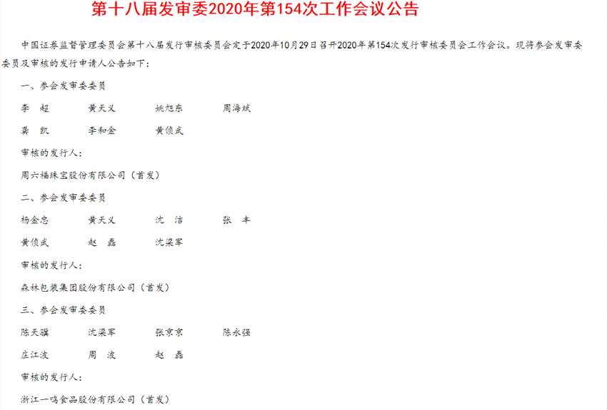 10月26日,獲悉,中國證券監(jiān)督管理委員會第十八屆發(fā)行審核委員會定于2020年10月29日召開2020年第154次發(fā)行審核委員會工作會議,屆時將審議周六福珠寶股份有限公司(以下簡稱:周六福)、森林包裝集團(tuán)股份有限公司(以下簡稱:森林包裝)、浙江一鳴食品股份有限公司(以下簡稱:一鳴食品)、杭州熱電集團(tuán)股份有限公司(以下簡稱:熱電集團(tuán))、江蘇必得科技股份有限公司(以下簡稱:必得科技)5家公司的A股IPO申請事項(xiàng)。