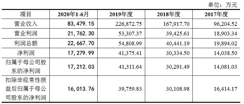 2017年至2020年上半年,周六福分別實(shí)現(xiàn)營業(yè)收入96,204.52萬元、167,917.70萬元、226,872.75萬元和83,479.15萬元;實(shí)現(xiàn)凈利潤14,038.50萬元、30,334.50萬元、41,375.41萬元和17,279.99萬元。