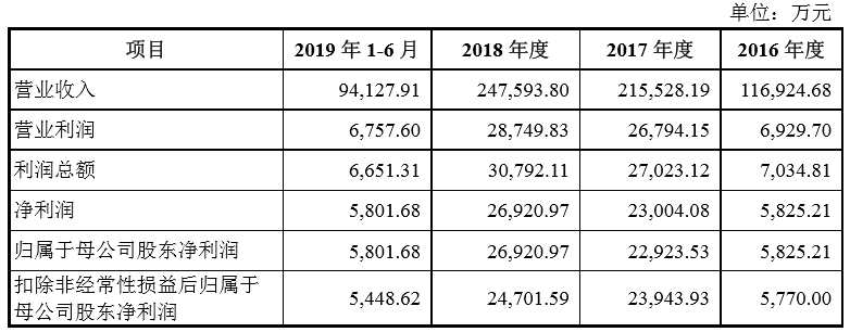 2016年至2019年上半年,森林包裝分別實(shí)現(xiàn)營業(yè)收入116,924.68萬元、215,528.19萬元、247,593.80萬元和94,127.91萬元;實(shí)現(xiàn)歸屬于母公司股東凈利潤5,825.21萬元、22,923.53萬元、26,920.97萬元和5,801.68萬元。