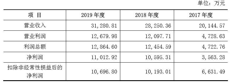 2017年至2019年,必得科技分別實(shí)現(xiàn)營業(yè)收入20,144.57萬元、28,250.36萬元和31,280.81萬元;實(shí)現(xiàn)凈利潤3,563.28萬元、10,595.31萬元和11,012.92萬元。