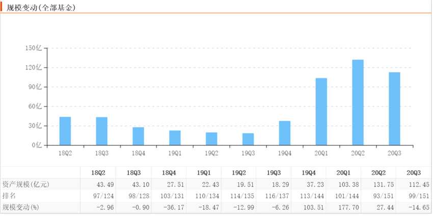 今日,華潤元大基金發(fā)布旗下14只(份額合并統(tǒng)計)基金產(chǎn)品2020年第3季度報告,結(jié)合Choice數(shù)據(jù)顯示,華潤元大基金2020年3季度資產(chǎn)規(guī)模下降超一成,相比于2季度的131.75億元,2020年3季度資產(chǎn)規(guī)模112.45億元。