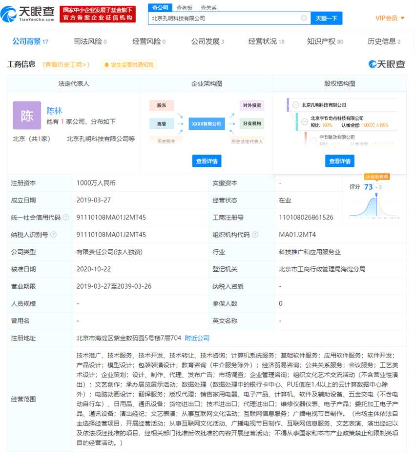 天眼查App顯示,北京孔明科技有限公司成立于2019年3月,注冊資本1000萬人民幣,經(jīng)營范圍包括技術(shù)推廣、技術(shù)服務(wù)、技術(shù)開發(fā)、技術(shù)轉(zhuǎn)讓、技術(shù)咨詢;教育咨詢(中介服務(wù)除外)等。