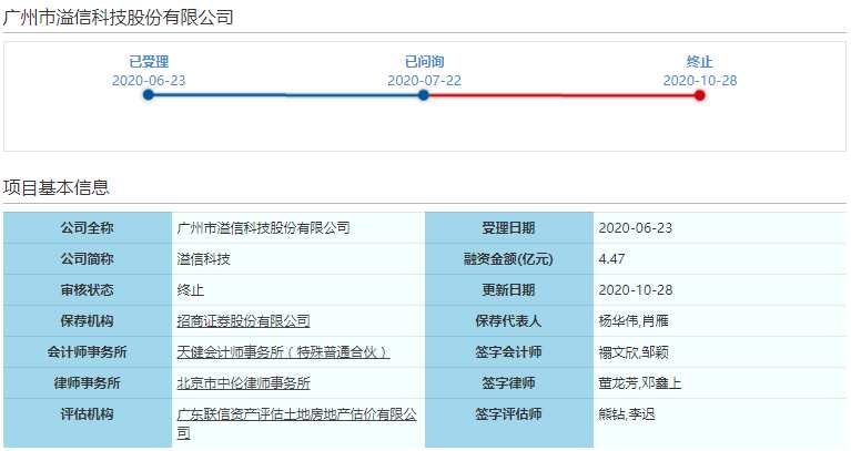 10月29日,獲悉,廣州市溢信科技股份有限公司(下稱:溢信科技)的科創(chuàng)板IPO申請已被終止。