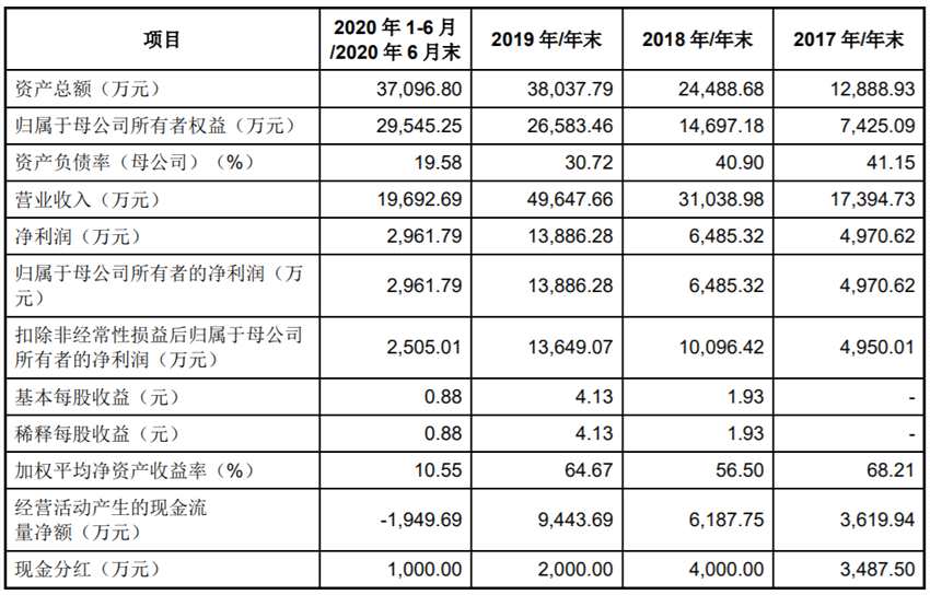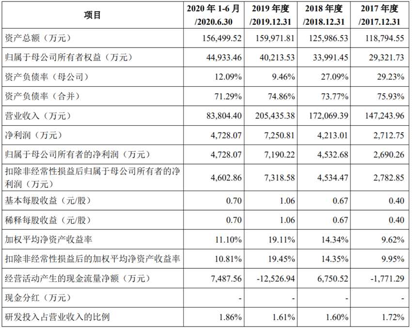2017年-2020年上半年,保立佳實現(xiàn)營業(yè)收入分別為14.72億元、17.21億元、20.54億元、8.38億元,歸屬于母公司所有者的凈利潤分別為2690.26萬元、4532.68萬元、7190.22萬元、4728.07萬元。