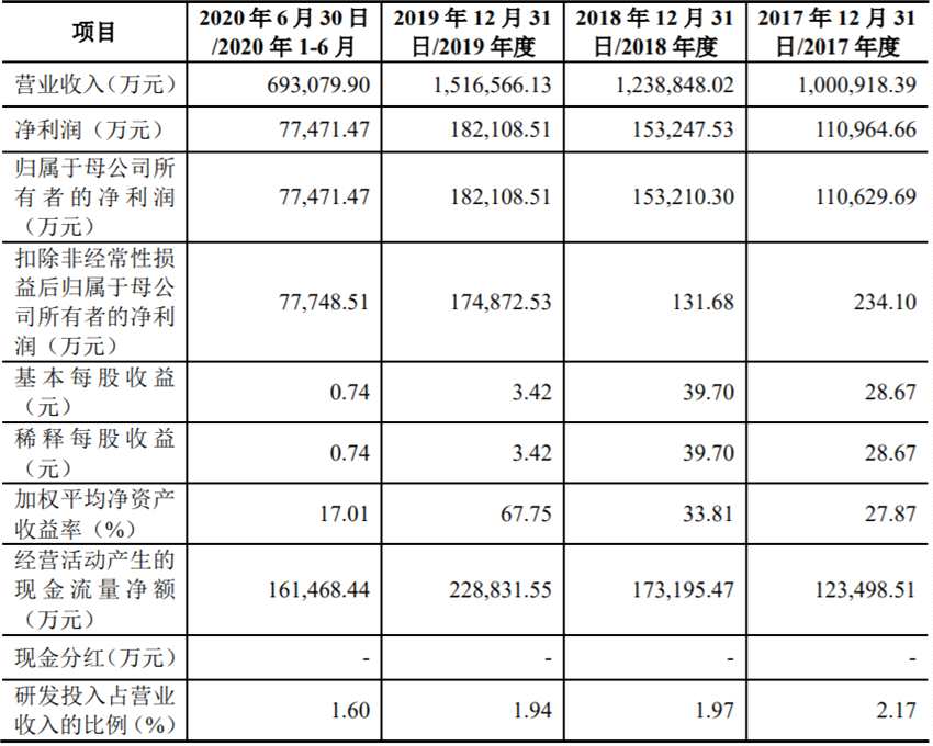 2017年-2020年上半年,華利股份實現(xiàn)營業(yè)收入分別為100.09億元、123.88億元、151.66億元、69.31億元,歸屬于母公司所有者的凈利潤分別為11.06億元、15.32億元、18.21億元、7.75億元。