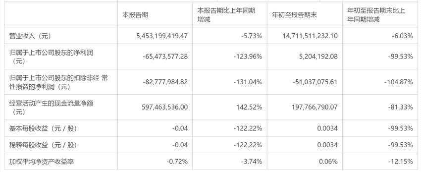 第三季度,申通快遞實現(xiàn)營業(yè)收入54.53億元,比上年同期下降5.73%,歸屬于上市公司股東的凈利潤-6547.36萬元,比上年同期下降123.96%。