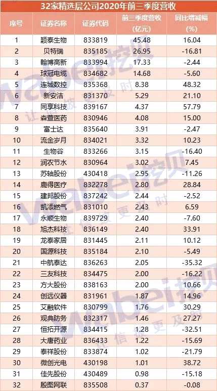 精選層三季報(bào)盤點(diǎn):32家實(shí)現(xiàn)營收177億元 一半公司營收正增長