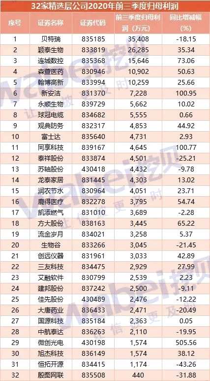 今年前三季度,32家精選層公司共實(shí)現(xiàn)凈利潤19億元。其中,5家企業(yè)利潤過億元。