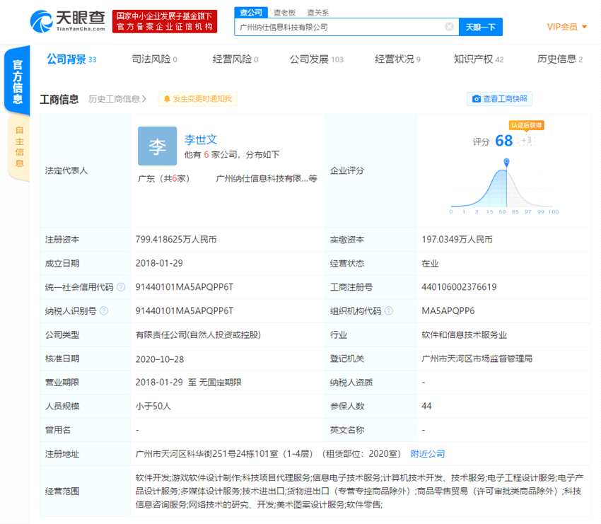 廣州納仕信息科技有限公司成立于2018年1月,法定代表人為李世文,經(jīng)營范圍包括軟件開發(fā);游戲軟件設計制作;科技項目代理服務;信息電子技術(shù)服務等。該公司第一大股東為李世文,持股54.2%;廣西騰訊創(chuàng)業(yè)投資有限公司為其第二大股東,持股20%。