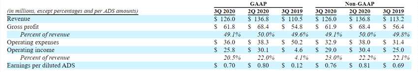 公司預(yù)計(jì),一般公認(rèn)會計(jì)原則下,2020年第四季度營收將在1.3億美元至1.39億美元之間,環(huán)比增長3%至10%;毛利率將在47.9%至49.9%之間。