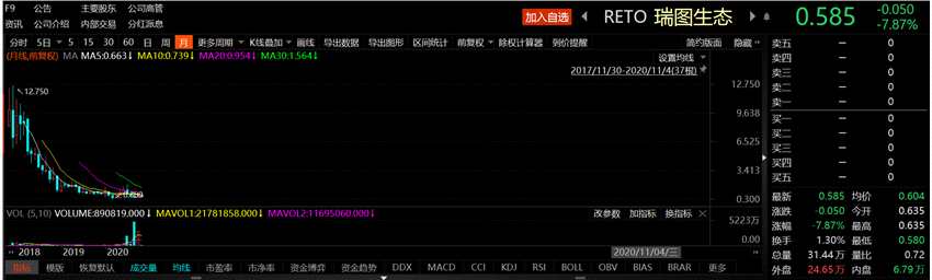 截至發(fā)稿,瑞圖生態(tài)報(bào)0.585美元,跌7.87%,總市值1412萬美元。公司股價(jià)較IPO發(fā)行價(jià)已跌去88.3%。