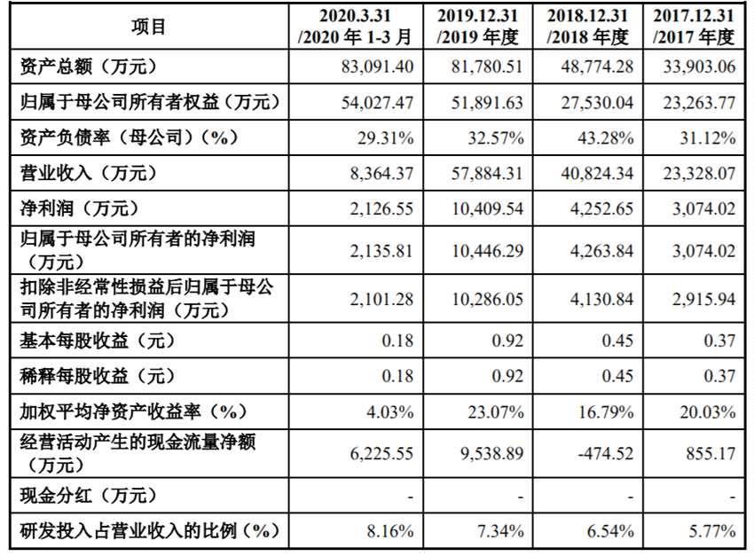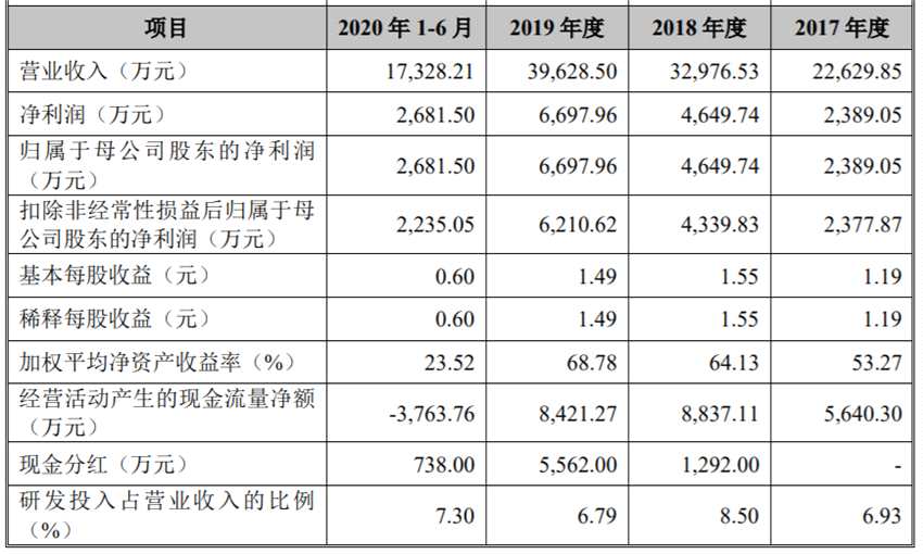 利和興專注于自動(dòng)化、智能化設(shè)備的研發(fā)、生產(chǎn)和銷售,致力于成為新一代信息和通信技術(shù)領(lǐng)域領(lǐng)先的智能制造解決方案提供商。公司實(shí)現(xiàn)2017年至2020上半年,營收分別為2.33億元、4.08億元、5.79億元、8364.37萬元;實(shí)現(xiàn)同期歸屬母公司凈利潤分別為3074.02萬元、4263.84萬元、1.04億元及2135.81萬元。公司于2015年12月10日掛牌新三板,于2019年7月4日摘牌。