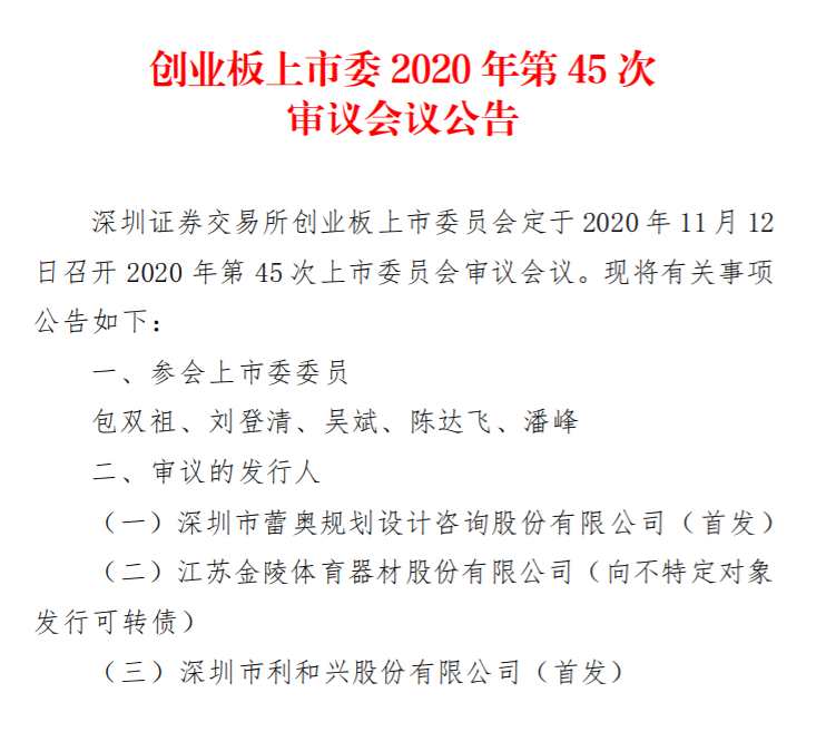 11月6日,獲悉,深圳證券交易所創(chuàng)業(yè)板上市委員會(huì)定于2020年11月12日召開2020年第45次上市委員會(huì)審議會(huì)議,屆時(shí)將審議:深圳市蕾奧規(guī)劃設(shè)計(jì)咨詢股份有限公司(下稱:蕾奧規(guī)劃)、深圳市利和興股份有限公司(下稱:利和興)2家公司IPO申請(qǐng)與江蘇【金陵體育(300651)、股吧】器材股份有限公司(下稱:金陵體育)1家公司的發(fā)行可轉(zhuǎn)債。