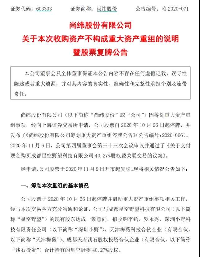 尚緯股份11月8日晚公告稱,公司擬以自有及自籌資金不超過5.89億元收購成都星空野望科技有限公司(簡(jiǎn)稱“星空野望”)40.27%股權(quán),后者背靠羅永浩,公司股票于2020年11月9日開市起復(fù)牌。同時(shí),公司股東李廣元通過協(xié)議轉(zhuǎn)讓方式向李鈞、龍泉淺秀互聯(lián)網(wǎng)合伙企業(yè)(有限合伙)(簡(jiǎn)稱“龍泉淺秀”)及孔劍平分別轉(zhuǎn)讓其所持有的上市公司2599.53萬股股權(quán)(合計(jì)占上市公司總股本的15%)(簡(jiǎn)稱“協(xié)議轉(zhuǎn)讓”)。