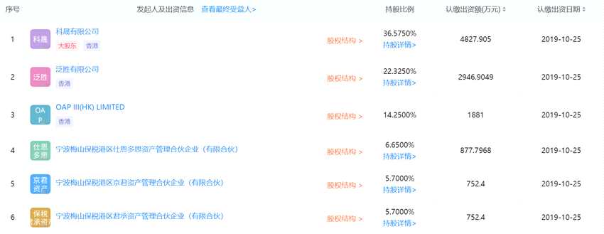 根據公司官網可知,大龍興創(chuàng)是一家高價值實驗室設備供應商,致力于開發(fā)和制造創(chuàng)新,可靠的應用工具,增強客戶運營的成功和價值。根據企查查數據顯示,大龍興創(chuàng)持股5%以上的股東包含:科晟有限公司出資4827.91萬元持股36.58%、泛勝有限公司出資2946.9萬元持股22.33%、OAPIII(HK)LIMITED出資1881萬元持股14.25%、寧波梅山保稅港區(qū)仕恩多思資產管理合伙企業(yè)(有限合伙)出資877.8萬元持股6.65%、寧波梅山保稅港區(qū)京君資產管理合伙企業(yè)(有限合伙)出資752.4萬元持股5.7%、寧波梅山保稅港區(qū)君承資產管理合伙企業(yè)(有限合伙)出資752.4萬元持股5.7%。