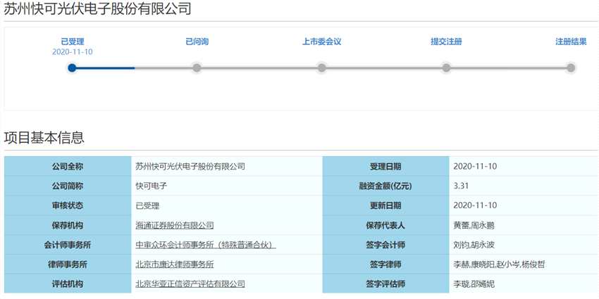 摘要: 11月11日,獲悉,蘇州快可光伏電子股份有限公司(以下簡稱:快可電子)的科創(chuàng)板IPO申請已于11月10日獲上交所受理,海通證券股份有限公司擔(dān)任保薦機(jī)構(gòu)。