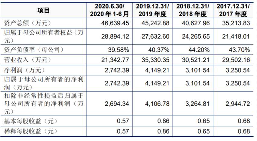 招股書財(cái)務(wù)數(shù)據(jù)顯示,2017年至2020年上半年,快可電子分別實(shí)現(xiàn)營業(yè)收入2.95億元、3.05億元、3.53億元和2.13億元;實(shí)現(xiàn)歸屬于母公司所有者的凈利潤3,250.54萬元、3,101.54萬元、4,149.21萬元和2,742.39萬元。