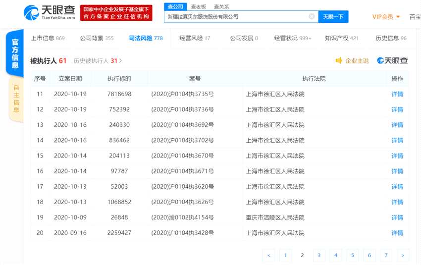 天眼查App司法風(fēng)險信息顯示,新疆拉夏貝爾服飾股份有限公司名下已有案號為(2020)浙0483執(zhí)2810號、(2020)蘇0581執(zhí)3609號2條失信被執(zhí)行人記錄,立案日期均在2020年7月,履行情況均為“全部未履行”。此外,新疆拉夏貝爾服飾股份有限公司名下已有數(shù)條被執(zhí)行人信息,僅10月21日的執(zhí)行標(biāo)的就超5000萬。