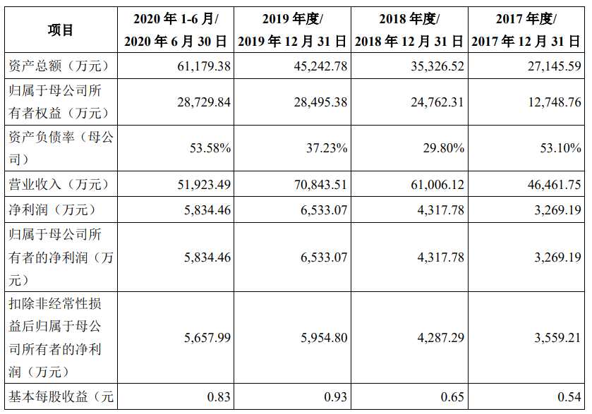 財(cái)務(wù)數(shù)據(jù)顯示,2017年至2020年上半年,西安凱立分別實(shí)現(xiàn)營(yíng)業(yè)收入4.65億元、6.1億元、7.08億元和5.19億元,實(shí)現(xiàn)歸屬于母公司所有者的凈利潤(rùn)3,269.19萬元、4,317.78萬元、6,533.07萬元和5,834.46萬元。