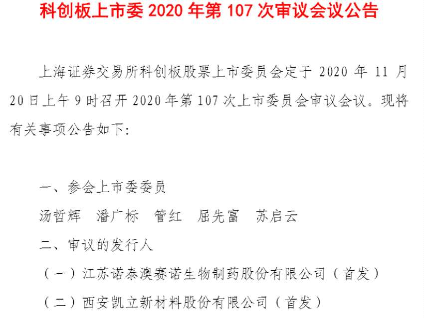 11月12日,獲悉,上海證券交易所科創(chuàng)板股票上市委員會(huì)定于2020年11月20日上午9時(shí)召開2020年第107次上市委員會(huì)審議會(huì)議。屆時(shí),江蘇諾泰澳賽諾生物制藥股份有限公司(以下簡(jiǎn)稱:諾泰生物)和西安凱立新材料股份有限公司(以下簡(jiǎn)稱:西安凱立)將接受審核。