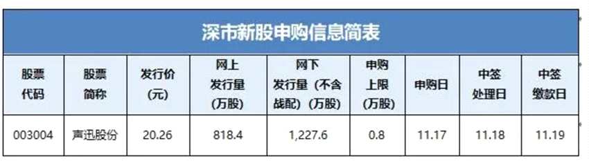 2020年11月17日,北京聲迅電子股份有限公司(簡(jiǎn)稱:聲迅股份)將通過(guò)深交所網(wǎng)下發(fā)行電子平臺(tái)和交易系統(tǒng)發(fā)行新股,具體信息如下: