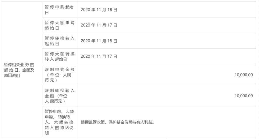 值得注意的是,申購火爆之下,11月16日傍晚,東方紅資產管理也發(fā)布《暫停大額申購、申購及轉換轉入業(yè)務的公告》,自11月17日(含)起該基金各類份額分別暫停接受單個基金賬戶1萬元以上(不含1萬元)的大額申購(A類份額含轉換轉入)業(yè)務申請。