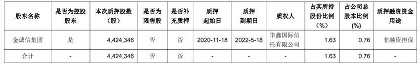 同日,金誠信發(fā)布控股股東部分股份質(zhì)押公告,公司于2020年11月19日收到控股股東金誠信集團(tuán)的告知函,金誠信集團(tuán)于2020年11月18日將其持有金誠信的無限售條件流通股442.43萬股(占其所持股份1.63%,占公司總股本0.76%)質(zhì)押給華鑫國際信托有限公司。