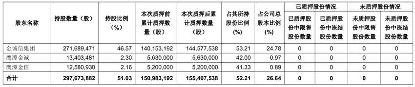 截至目前,金誠信集團(tuán)直接持有公司股份共計(jì)2.72億股,占公司總股本的46.57%,其中已累計(jì)質(zhì)押(含本次)1.45億股,占公司總股本的24.78%,占其直接持有公司股份總數(shù)的53.21%。