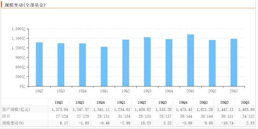基金管理人為民生加銀基金,三季度末實現(xiàn)資產規(guī)模1,483.80億元,小幅度上升。通過近兩年資產規(guī)模對比,可以發(fā)現(xiàn)其資產規(guī)模只在2019年3季度末、2020年1季度末站上1500億元外,其他季度規(guī)模一直起伏不斷。如三季度規(guī)模有所上升,但最終還是未站上1500億元。
