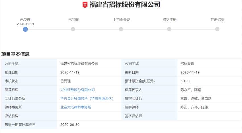 11月20日,獲悉,福建省招標(biāo)股份有限公司(公司簡(jiǎn)稱:招標(biāo)股份)向深圳證券交易所報(bào)送了創(chuàng)業(yè)板IPO申報(bào)材料,并于11月19日獲深交所受理,保薦機(jī)構(gòu)為興業(yè)證券。