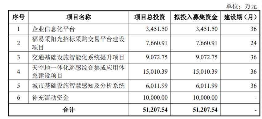 招標(biāo)股份本次擬發(fā)行不超過(guò)6880.12萬(wàn)股(不含采用超額配售選擇權(quán)發(fā)行的股票數(shù)量),擬募資資金總額不超過(guò)5.12億元,本次募集資金投資項(xiàng)目均圍繞主營(yíng)業(yè)務(wù)進(jìn)行,資金到位后,將投資于企業(yè)信息化平臺(tái)、福易采陽(yáng)光招標(biāo)采購(gòu)交易平臺(tái)建設(shè)項(xiàng)目、交通基礎(chǔ)設(shè)施智能化系統(tǒng)提升項(xiàng)目、天空地一體化遙感綜合集成應(yīng)用體系建設(shè)項(xiàng)目、城市基礎(chǔ)設(shè)施智慧感知及分析系統(tǒng)、補(bǔ)充流動(dòng)資金。