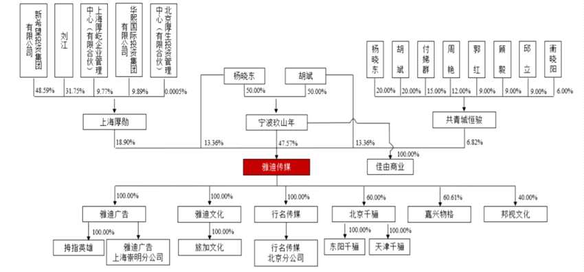 截至招股說明書簽署日,玖山年持有雅迪傳媒47.57%的股權,為公司的控股股東。楊曉東和胡斌分別直接/間接持有公司2,887.92萬股的股份,持股比例均為38.51%,為公司的共同實際控制人。
