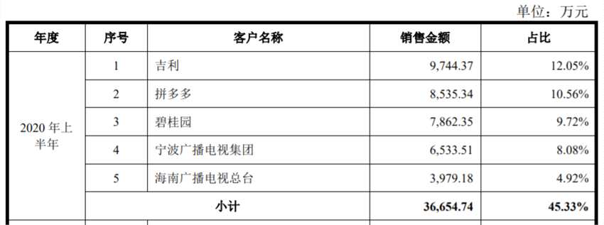 公司披露的招股書顯示,2020年上半年,雅迪傳媒的前五大客戶分別為吉利、拼多多、碧桂園、寧波廣播電視集團和海南廣播電視集團。上半年前五大客戶銷售金額為3.67億元,占比為45.33%。其中,碧桂園自2017年以來,一直穩(wěn)居公司前五大客戶行列。