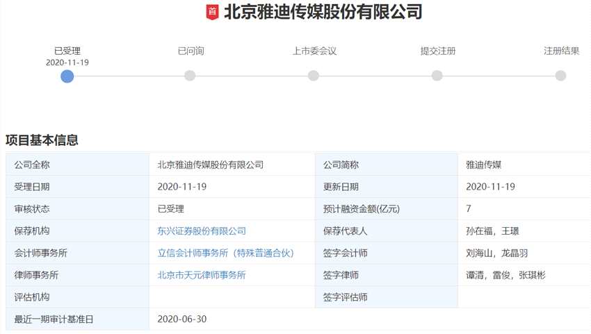 雅迪傳媒)的創(chuàng)業(yè)板IPO申請已于11月19日獲深交所受理,東興證券股份有限公司擔任其保薦機構。