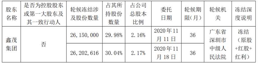 富通鑫茂于近日獲悉公司股東鑫茂集團(tuán)所持公司的5235.26萬(wàn)股,被廣東省深圳市中級(jí)人民法院安排司法輪候凍結(jié),輪候期限36個(gè)月。
