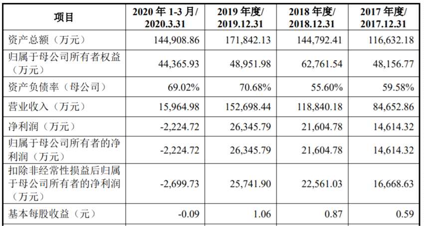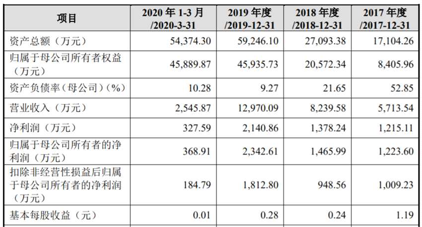 財務(wù)數(shù)據(jù)顯示,公司2017年至2020年第一季度營收分別為5,713.54萬元、8,239.58萬元、1.30億元、2,545.87萬元;同期對應的凈利潤分別為1,215.11萬元、1,378.24萬元、2,140.86萬元、327.59萬元。