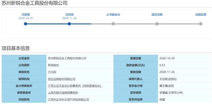 11月27日,獲悉,蘇州新銳合金工具股份有限公司(以下簡稱:新銳股份)的科創(chuàng)板IPO申請已于11月26日獲上交所問詢。