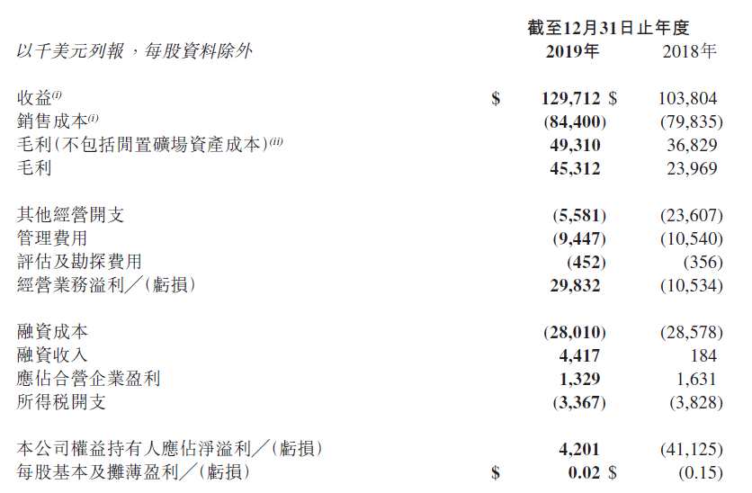 11月27日,獲悉,港股上市公司南戈壁-S(01878.HK)發(fā)布截至2019年12月31日止全年業(yè)績,該集團實現(xiàn)收益1.3億美元,同比增加24.96%;公司權(quán)益持有人應(yīng)占凈溢利420.1萬美元,2018年同期則虧損4112.5萬美元;每股基本及攤薄盈利0.02美元。