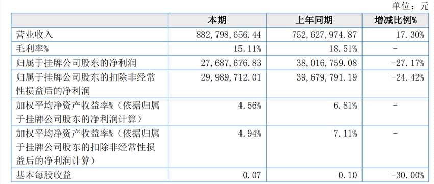 報(bào)告期內(nèi),大地股份2020年上半年公司共實(shí)現(xiàn)營(yíng)業(yè)收入8.83億元,同比增長(zhǎng)17.30%;實(shí)現(xiàn)歸屬于掛牌公司股東的凈利潤(rùn)合計(jì)為2,768.77萬(wàn)元,比上年同期下降27.17%,扣除非經(jīng)常性損益后的凈利潤(rùn)為2,998.97萬(wàn)元,比上年同期下降24.42%。