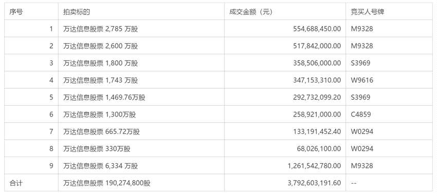 上述拍賣,萬達信息股票1.9億股分成9項拍賣標(biāo)的,分別由5位競買人競拍成交,拍賣成交合計金額為37.93億元。