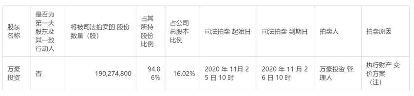根據(jù)2020年7月24日萬豪投資破產(chǎn)清算案第二次債權(quán)人會議表決通過的《上海萬豪投資有限公司財產(chǎn)變價方案》,萬豪投資管理人對萬豪投資持有的公司股票共計1.9億股(已被法院凍結(jié))采用公開拍賣方式進行變價。
