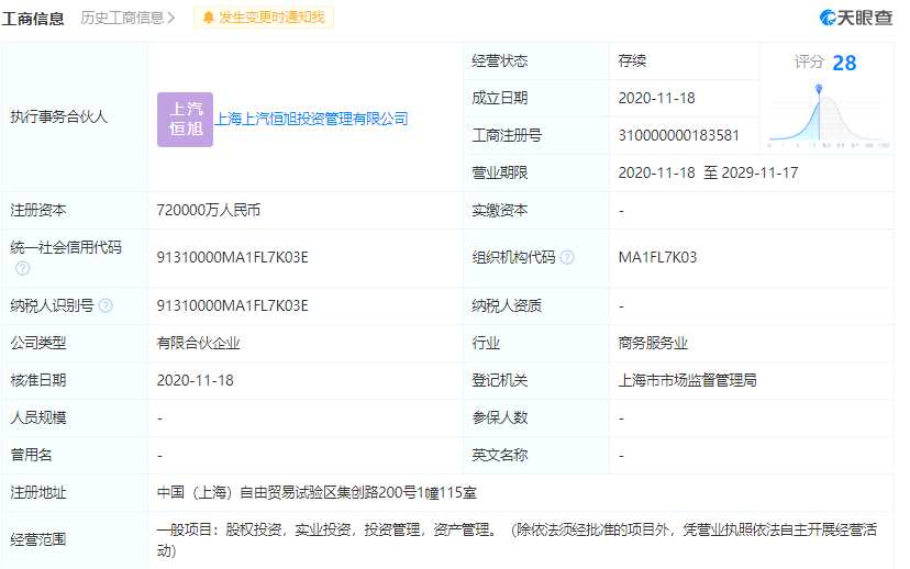 天眼查App顯示,上海元界智能科技股權(quán)投資基金合伙企業(yè)(有限合伙)成立于2020年11月,注冊資本72億人民幣,執(zhí)行事務(wù)合伙人為上海上汽恒旭投資管理有限公司。經(jīng)營范圍包括股權(quán)投資,實業(yè)投資,投資管理,資產(chǎn)管理等。